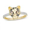 Crafted in warm 10K yellow gold and black rhodium plating, this ring showcases a sculpted cheetah head with captivating champagne diamond eyes and black rhodium plating speckled design. A double row of sparkling white diamonds set in the setting completes the look. With 1/10 carat diamonds and a brilliant polished finish, this ring exudes intense light.