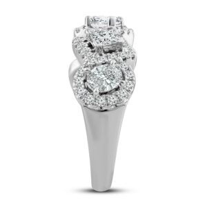 This striking diamond ring collection features five distinctively-shaped diamonds, symbolic of everything she means to you. Each diamond shape has a different meaning, from integrity and wisdom, to confidence, totality, and elegance. This gorgeous 10K white gold ring features a pear-shaped, round-cut, emerald-cut, princess-cut, and oval-cut diamond, each surrounded by a frame of sparkling round-cut diamonds. The ring has a total diamond weight of 1 3/4 carats.