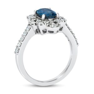 Please note: This ring is available in limited sizes. If you dont see your size here, please visit a store to order your ring.This enchanting ring features a beautiful natural Blueberry Sapphire haloed by irresistible Vanilla Diamonds set in powerful platinum. Additional Vanilla Diamonds line the band to complete the look. The total diamond weight of the ring is 5/8 carat.