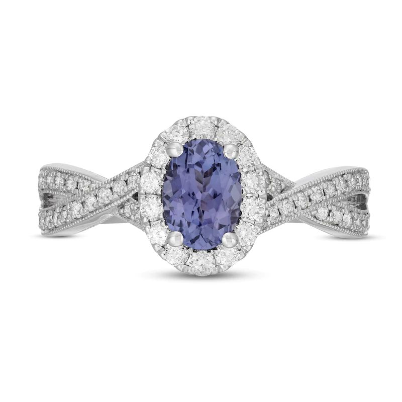 A vivid oval-cut tanzanite draws the eye to this splendid engagement ring. Radiant round diamonds halo the center and shimmer down the twisting 14K white gold band for a total diamond weight of 5/8 carat.